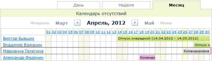 В результате на странице График отсутствий в секции Месяц будет добавлена запись об отсутствии.